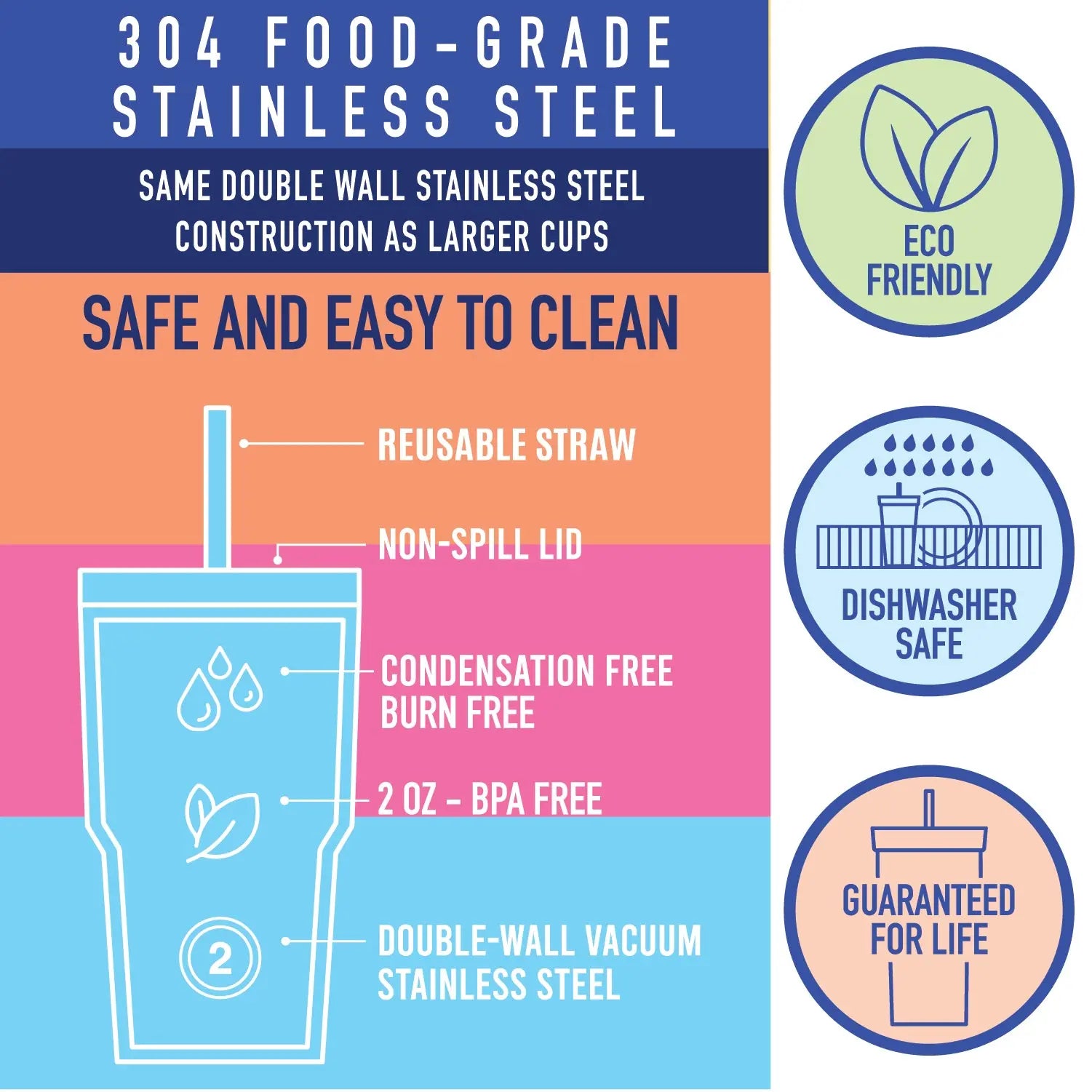 Keep your drinks at the perfect temperature all day long with our Stainless Steel 2oz Insulated Mini Tumblers. Made with double-layered ceramic and stainless steel, and featuring non-spill lid and condensation-free design, this cup is perfect for on-the-go use. Double layer stops heat transfer from conduction vacuum insulation stops heat transfer from convection reflective copper stops heat transfer from radiation. The vacuum insulation and reflective copper provide 8 hours of ice-cold drinks. BPA-free and fits most cup holders. Perfect for shots - from espresso to alcohol, you can use this itty-bitty cup for lots!