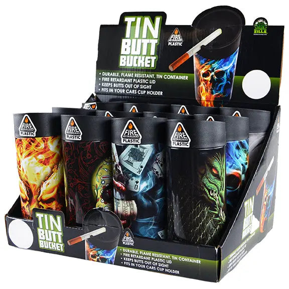 This durable, flame resistant tin butt bucket keep butts out of sight and fits in your cars cup holder. Comes in a variety of printed designs.