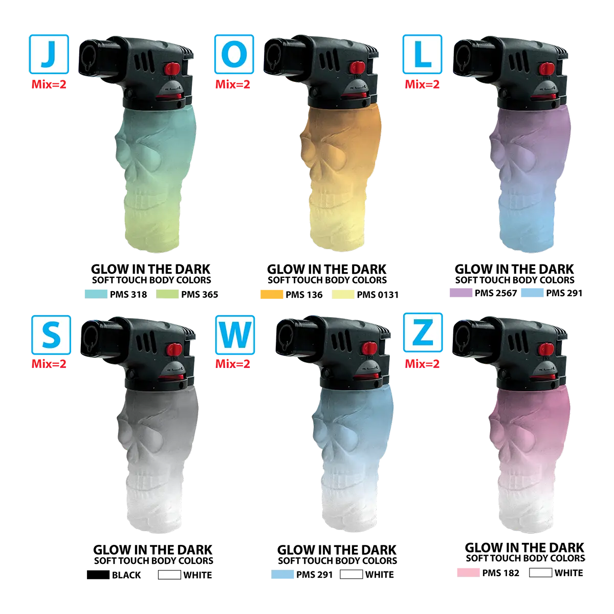 Unleash the fiery glow of our Glow in the Dark(GID) Skull Torch! Perfect for outdoor adventures, this refillable butane torch boasts an extra high temperature of 2300° and a safety lock for added security. The blue flame refillable feature ensures long-lasting use. Illuminate the night with this one-of-a-kind product.