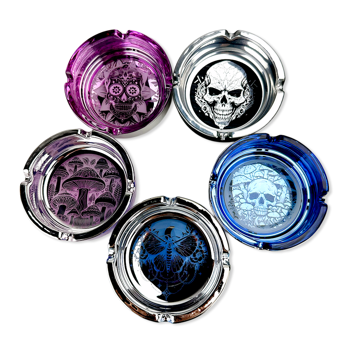 Elevate your smoking experience with our Glass Plated Ashtray! This heat resistant and dishwasher safe ashtray won't burn, making it perfect for all your smoking needs. Its cool designs add a touch of style while its functionality allows for use with cigarettes, coins, and more. Upgrade your ashtray game today!