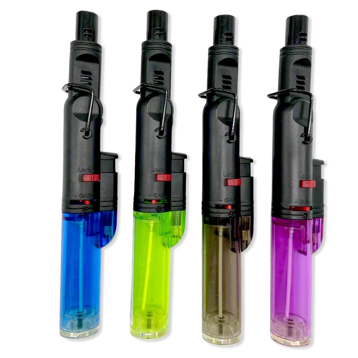 Smokezilla 45º Pivot Torch works at any angle — even upside down! Small enough to fit in your pocket, yet powerful and versatile enough for any task; from lighting candles, grills, bonfires and more! Safety cap stops ignition when closed. Refillable butane tank. Each display includes a variety of transparent color styles.