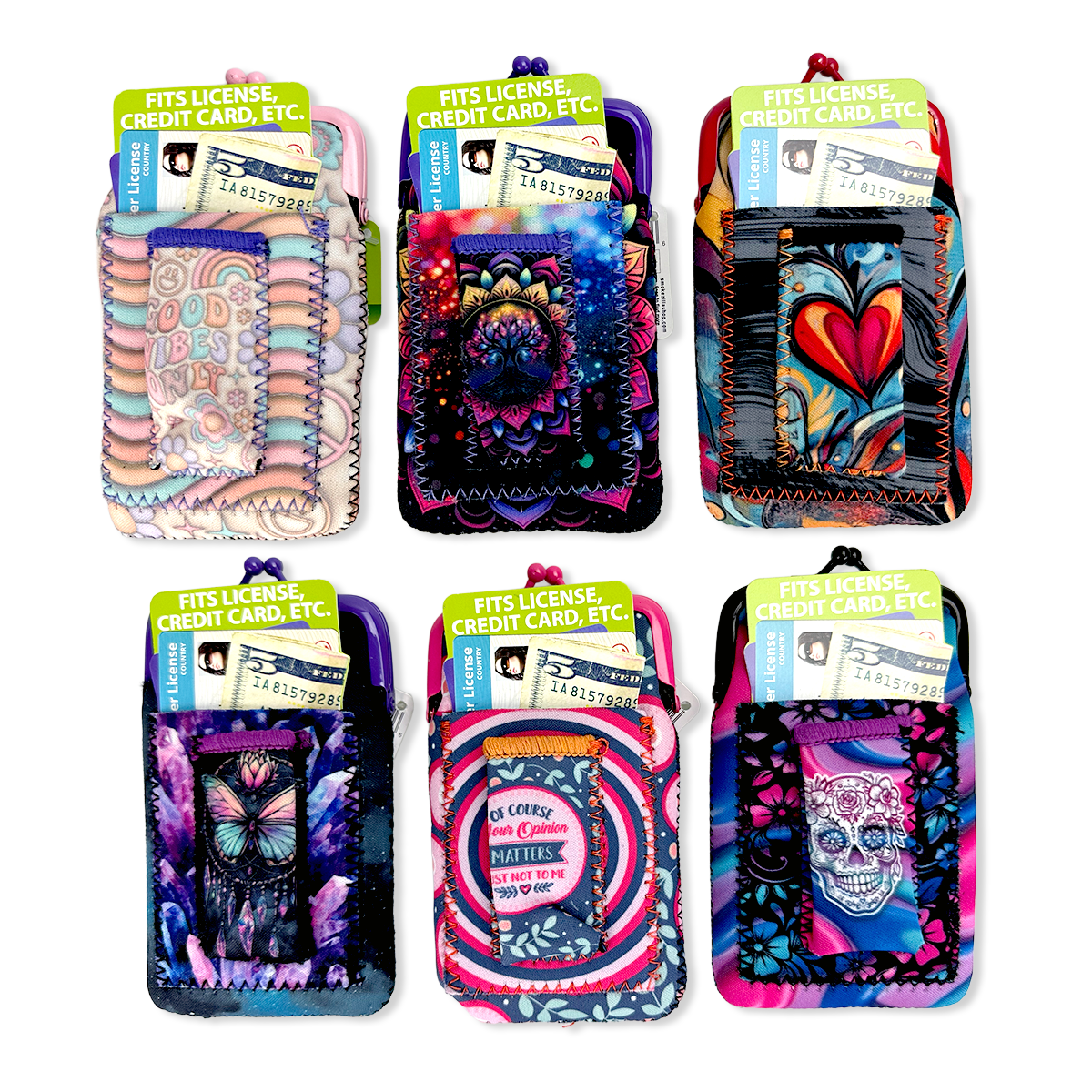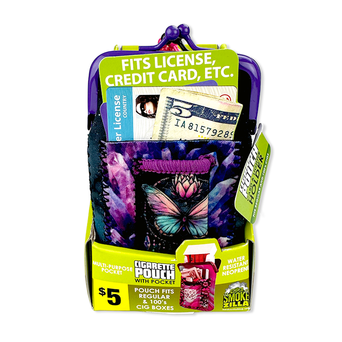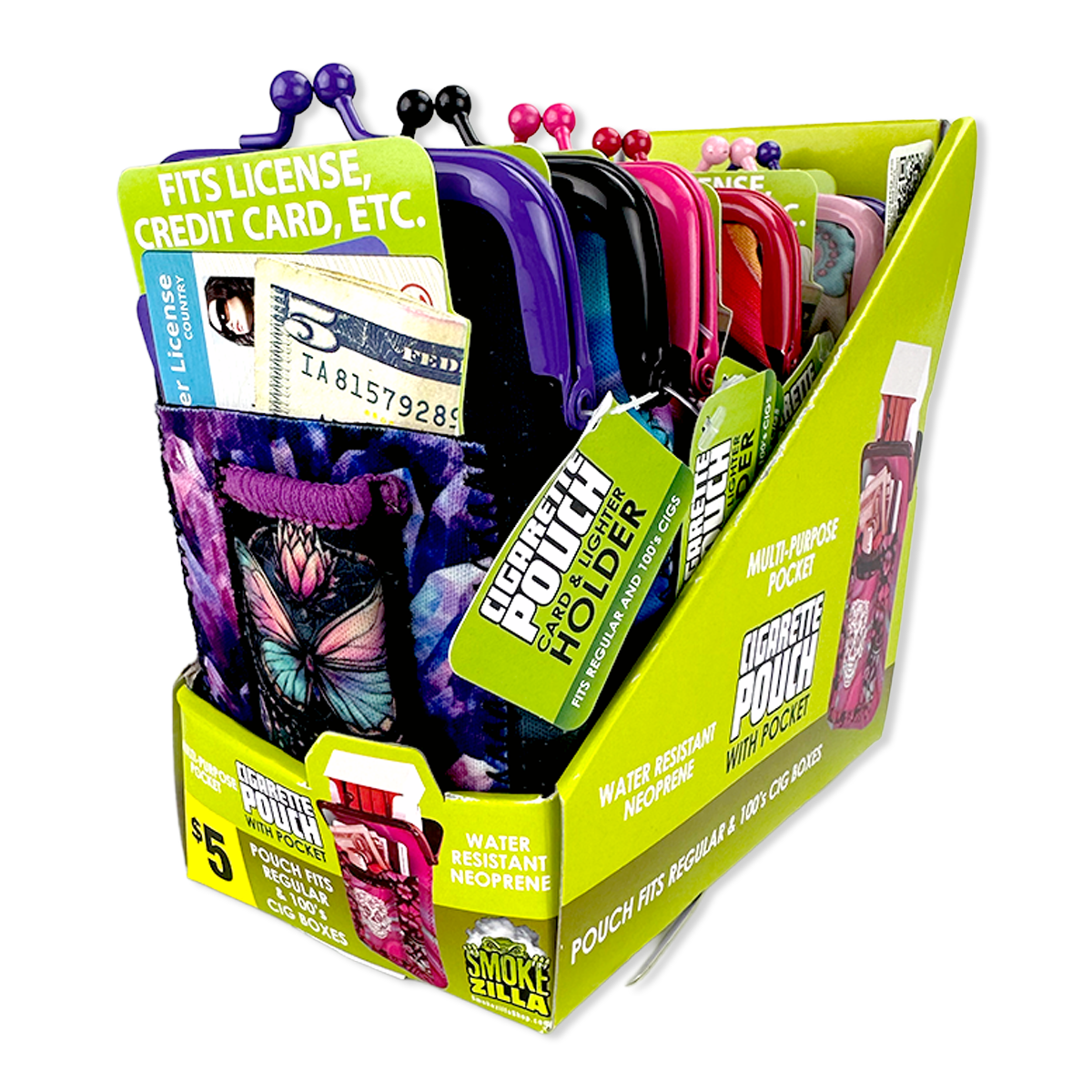 Water resistant clasp pouches that include a lighter slot and card holder! Fits regular and 100s cigarette boxes. Each display includes various relatable, trendy designs and phrase styles.