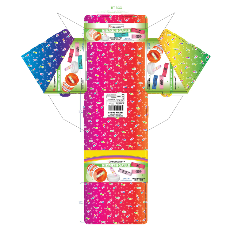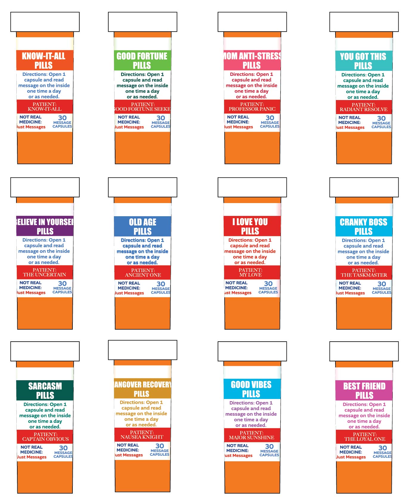 Prescription for happiness in a bottle. Each Moodscript bottle contains 30 plain capsules filled with colorful notes—each one handwritten with an uplifting message, a silly joke, an inspiring quote, or a sweet reminder. Pop open a capsule whenever you need a mood boost and discover what's inside. It's like taking your daily dose of positivity. Perfect for gifting, collecting, or keeping by your bedside for those moments when you need a little pick-me-up. One capsule at a time, one smile at a time!