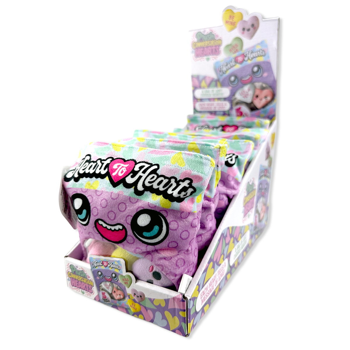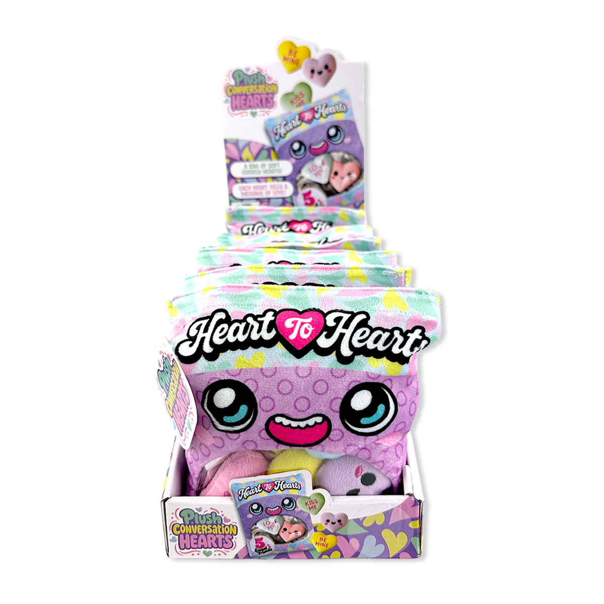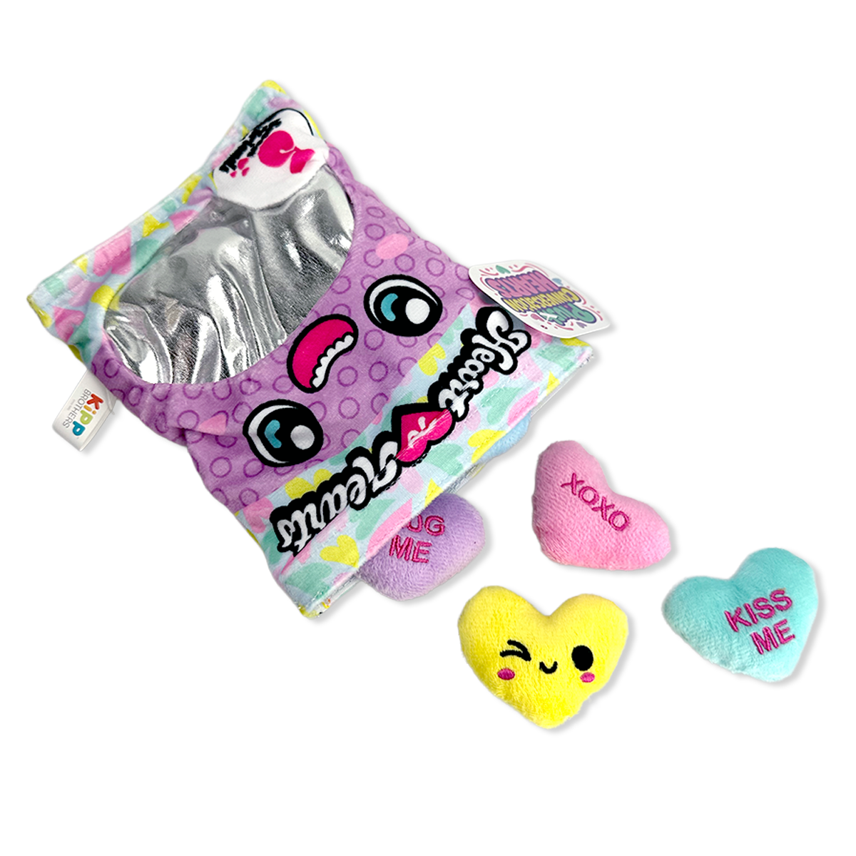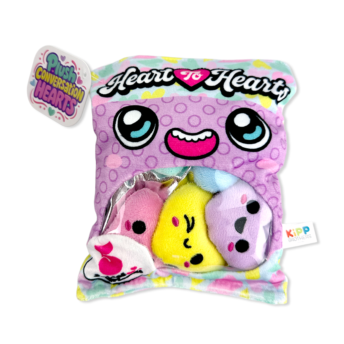 Bring a burst of fun and sweetness to any space with this Plush Bag of Conversation Hearts! Each display includes 6 delightfully soft, cuddly hearts perfect for gifting, decorating, or just collecting. They’re a playful twist on the classic candy conversation hearts, ready to spread smiles and cozy vibes wherever they go.
