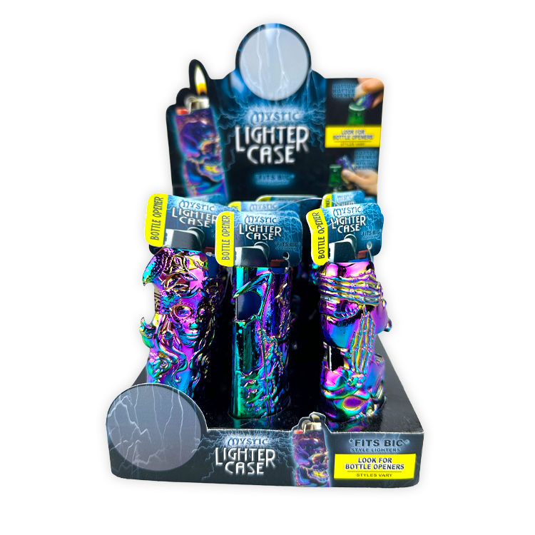 Mystic lighter cases that fit BIC® lighters. Assorted designs with some styles featuring a bottle opener. Finished with an iridescent RAINBOW style look.