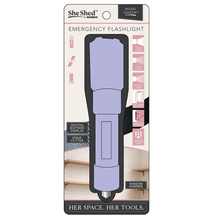 Her essential emergency companion. The Road Queen Emergency Car Light Multi-Tool combines super bright LED lights with a digital battery display, so she always knows her charge level. Features a rechargeable 800MAH battery with USB-C charging, plus a safety light and emergency seat belt cutter. Her space, her tools - designed for confidence on every drive.